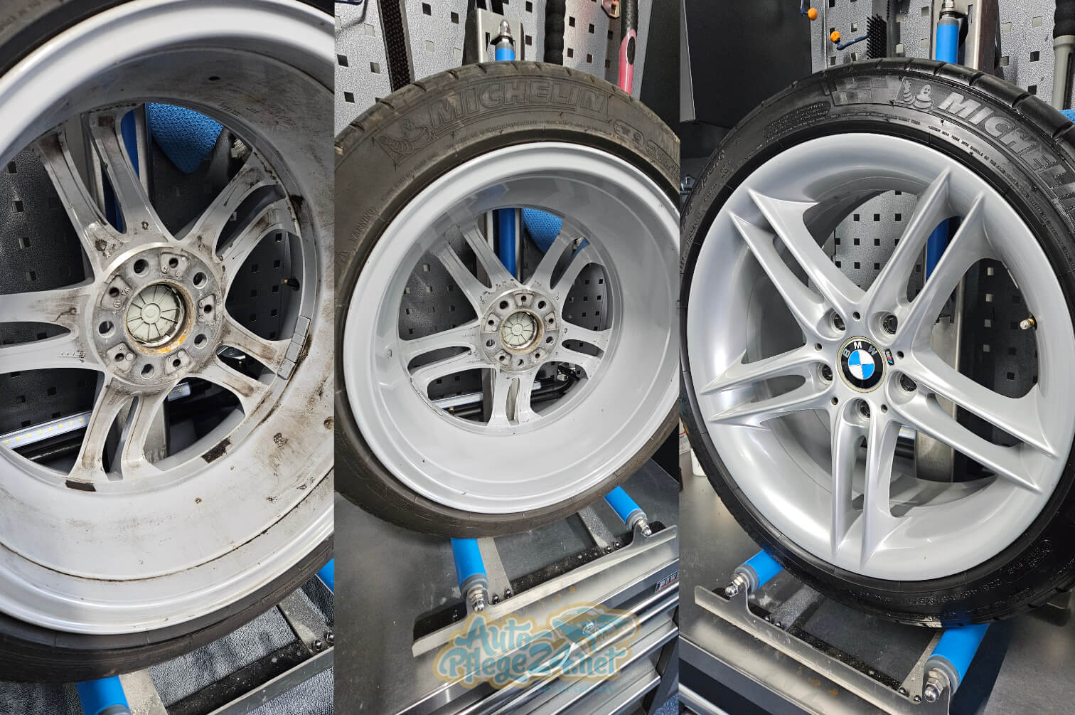 Für die Felgenaufbereitung wurden die Räder demontiert. Die Außenseiten wurden von Hand aufbereitet, um auch empfindliche Bereiche schonend zu bearbeiten. Im Tiefbett konnte zusätzlich maschinell gearbeitet werden, um ein gleichmäßiges und sauberes Ergebnis zu erzielen.